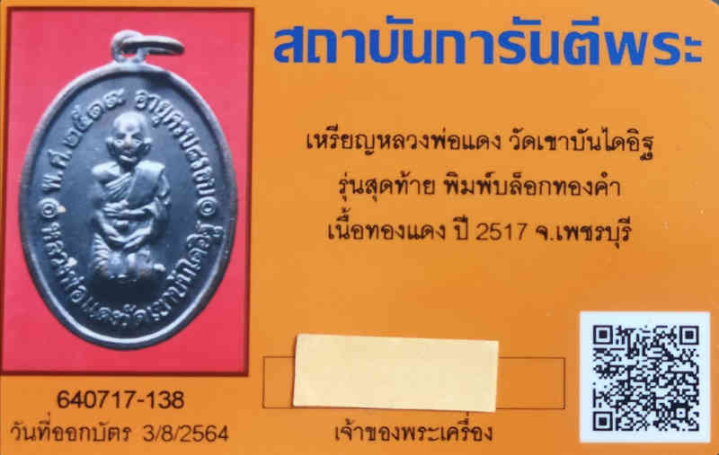 เหรียญหลวงพ่อแดง วัดเขาบันไดอิฐ รุ่นสุดท้าย พิมพ์บล็อกทองคำ เนื้อทองแดง ปี 2517 จ.เพชรบุรี มีบัตรรับรอง |