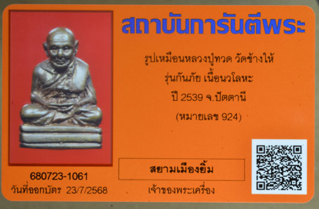หลวงปู่ทวด พิมพ์เบตง รุ่นกันภัย วัดช้างให้ ออกวัดโดยตรง ปี 39 เนื้อนวะโลหะ จำนวนสร้างเท่าพ.ศ. 2,539 องค์