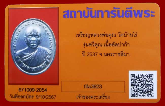 แดงที่เคาะแรก !!! เหรียญรุ่นทวีคูณ เนื้ออัลปาก้า หลวงพ่อคูณ วัดบ้านไร่ ปี2537 + บัตรพระแท้