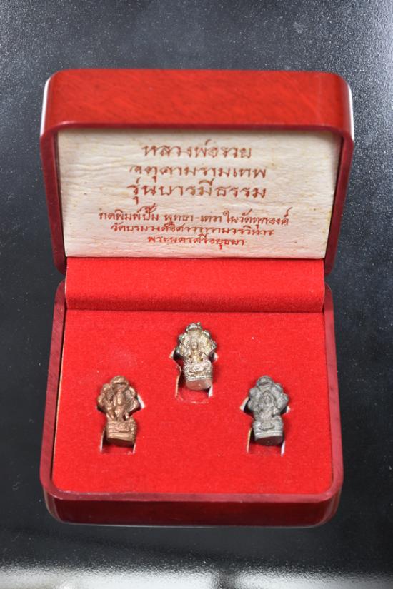 องค์พ่อจตุคาม รุ่น บารมีธรรม วัดบรมวงค์อิศรวรารามวรวิหาร จ.พ ระนครศรีอยุธยา หลวงพ่อรวยปลุกเสก ปี 2550 เนื้อเงิน+นวะ+ทองแด ง พร้อมกล่อง |