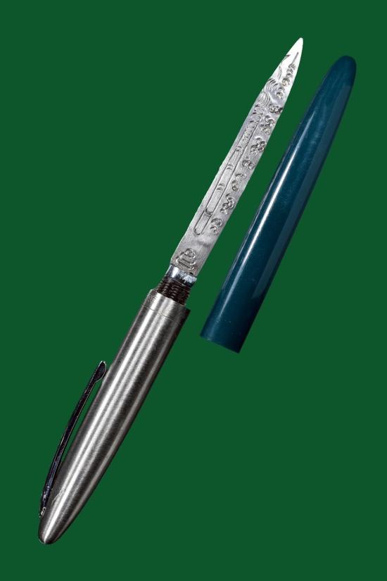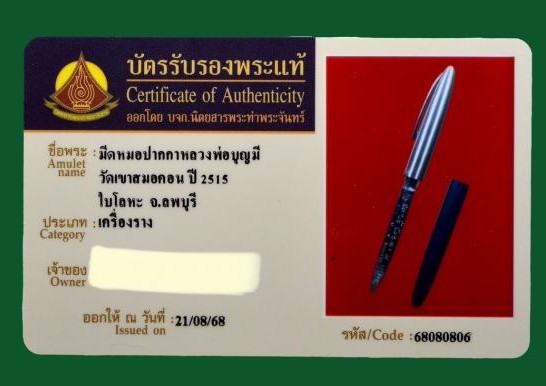 มีดหมอปากกาหลวงพ่อบุญมี วัดเขาสมอคอน จ.ลพบุรี ใบโลหะ สร้างปี 2515 (บัตรรับรองนิตยสารพระท่าพระจันทร์) |