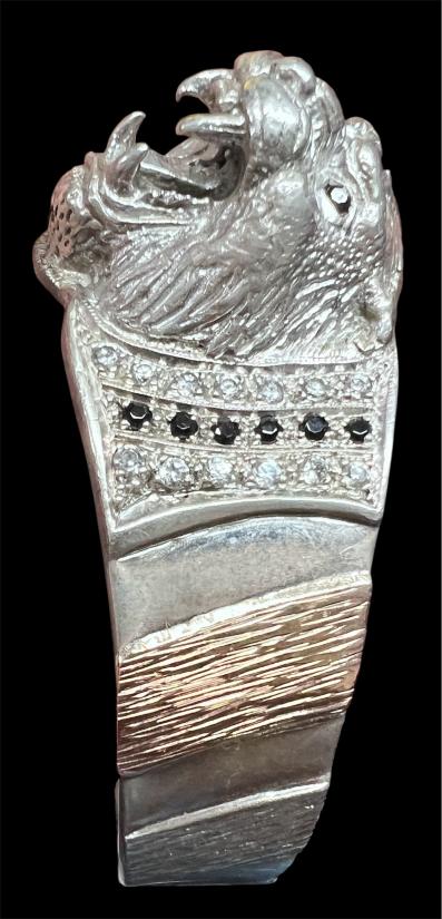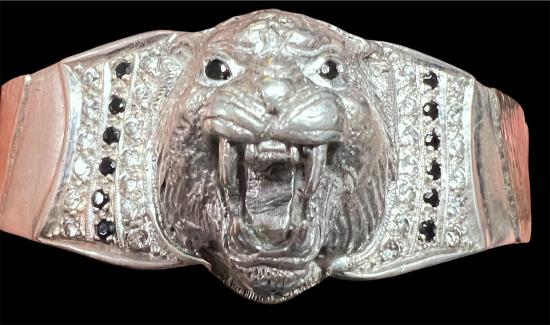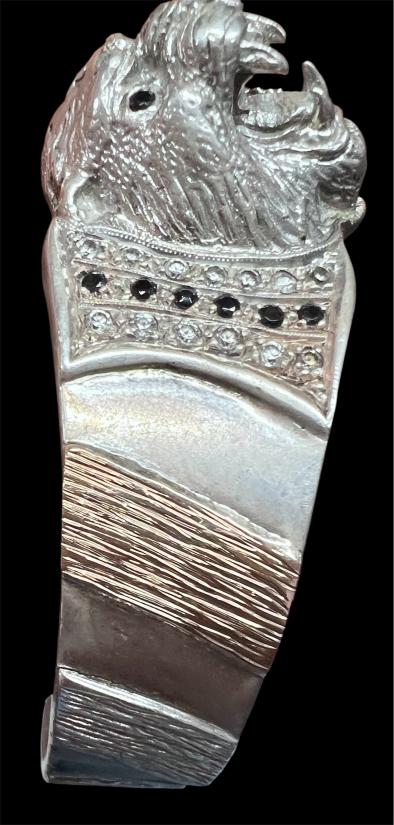 วัดใจเคาะเดียว////กำไรข้อมือ พญาหัวเสือ หลวงพ่อเปิ่น วัดบางพระ สั่งทำ ตัวเรือนเงินแท้ชุบทองคำขาว 95.77% แปะทองคำพิงค์โกลด์ นาค 38.24%ฝังเพชร CZ พลอยดำ หนาหนักเกือบ 50 กรัมสั่งทำมา 10,000 บาท