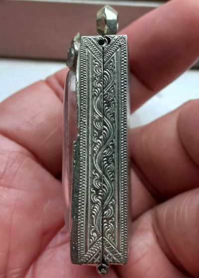 ตลับเก่า เงินผสม สำหรับใส่พระสมเด็จ ขนาดกรอบด้านใน กว้าง 3 ซม. สูง 4 ซม. หนาประมาณ 1 ซม. |