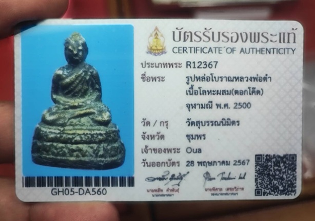วัดใจ 1,200 บาท รูปหล่อหลวงพ่อดำ วัดสุบรรณนิมิตร จ.ชุมพร ตอกโค๊ดจุฬามนี ปี 2500 มีบัตรสมาคมฯ