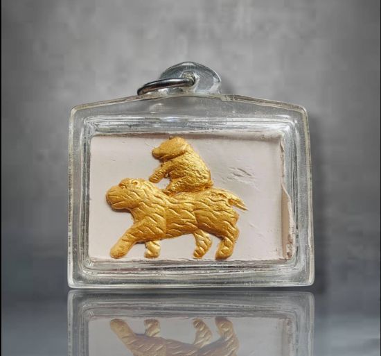 หมูขี่เสือ เนื้อผงพุทธคุณ ปัดทอง ครูบาคำเป็ง สำนักสงฆ์มะค่างาม จังหวัดกำแพงเพชร พร้อมเลี่ยมกันน้ำ
