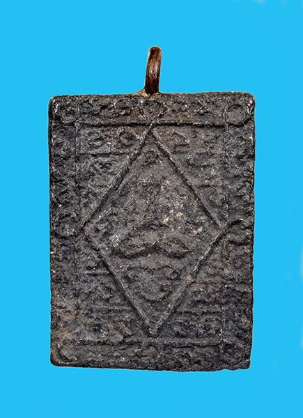 เนื้อตะกั่ว สูง 3.5 ซม. ฐานกว้าง 2.5 ซม. หูเชื่อมทองแดง ไม่ทราบที่ครับ