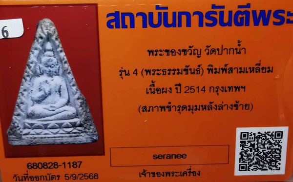พระของขวัญ วัดปากน้ำ รุ่น4(พระธรรมขันธ์) พิมพ์สามเหลี่ยม เนื้อผง ปี2514 กทม + บัตรG-pra พระสภาพระบุตามบัตรรับรอง สภาพตามรูปทุกประการค่ะ