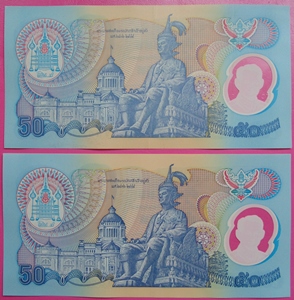ธนบัตรที่ระลึก เนื่องในวโรกาสทรงครองสิริราชยสมบัติครบ 50 ปี ( กาญจนาภิเษก ) ปี 2539 ฉบับราคา 50 บาท. 2 ฉบับ 2 ลายเซ็น สภาพสวยไม่ได้ใช้ ไม่มีรอยพับ เลขท้าย 007 ตามรูป