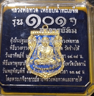 เหรียญเลื่อนสมนศักดิ์ หลวงปู่ทวด รุ่น 101 ปี 2556 อาจารย์ทิม เนื้อทองระฆังลงยา สีน้ำเงิน เลข 2200 ราคาวัดใจ กล่องเดิม |
