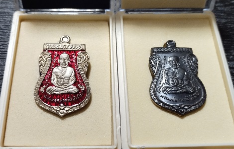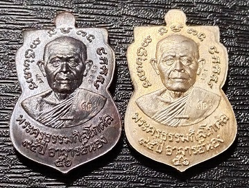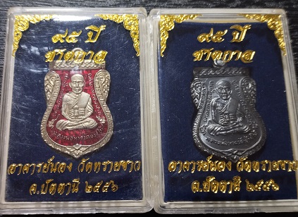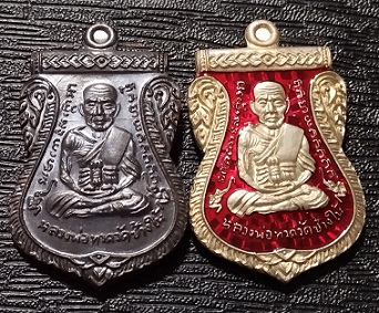 เหรียญเสมาหน้าเลื่อนหลวงพ่อทวด #ปี2556 95 ปี ชาตกาล อาจารย์นอง วัดทรายขาว #เนื้อทองแดงรมดำ บล็อคทองคำ เลข 3389 เนื้ออัลปาก้าลงยาสีแดง เลข 414 เคาะเดียว 2เหรียญ |