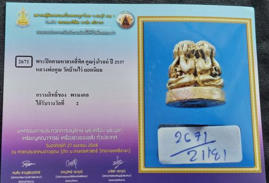 พระปิดตาสี่ทิศ รุ่นคูณรุ่งโรจน์ เนื้อนวโลหะ ปี 2537 พร้อมใบประกาศ ติดรางวัลที่ 2 งานจังหวัดชลบุรี (งานสมาคมฯ)