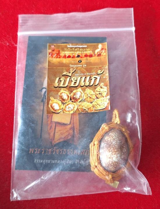 เบี้ยแก้ หุ้มจีวร ถักเชือก หลวงปู่ศิลา วัดโพธิ์ศรีสะอาด มีแผ่นเลขกำกับ ฝังตะกรุดทองเหลือง พร้อมใบคาถา ปี2567 |