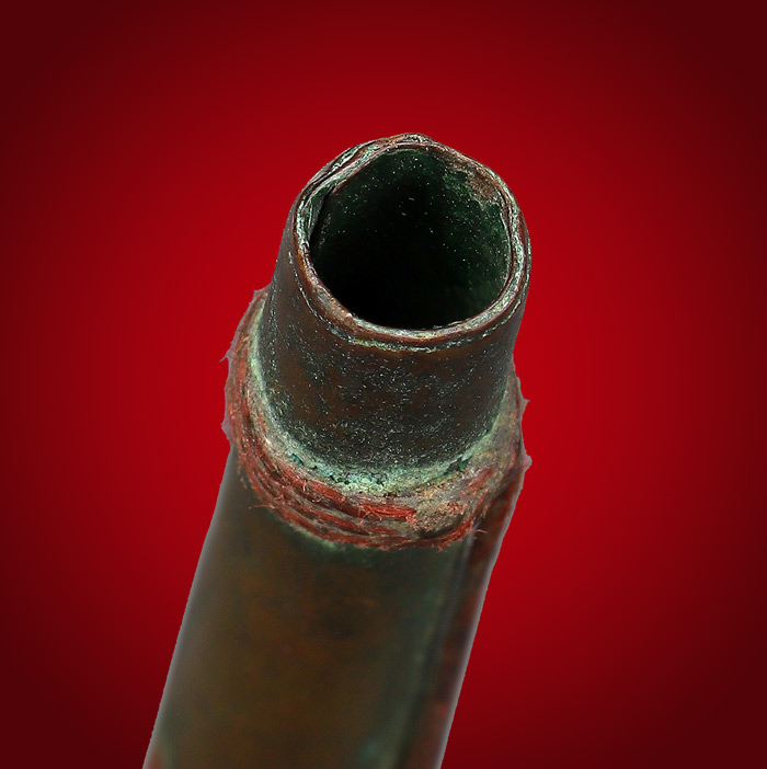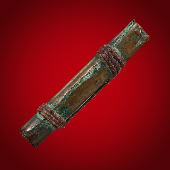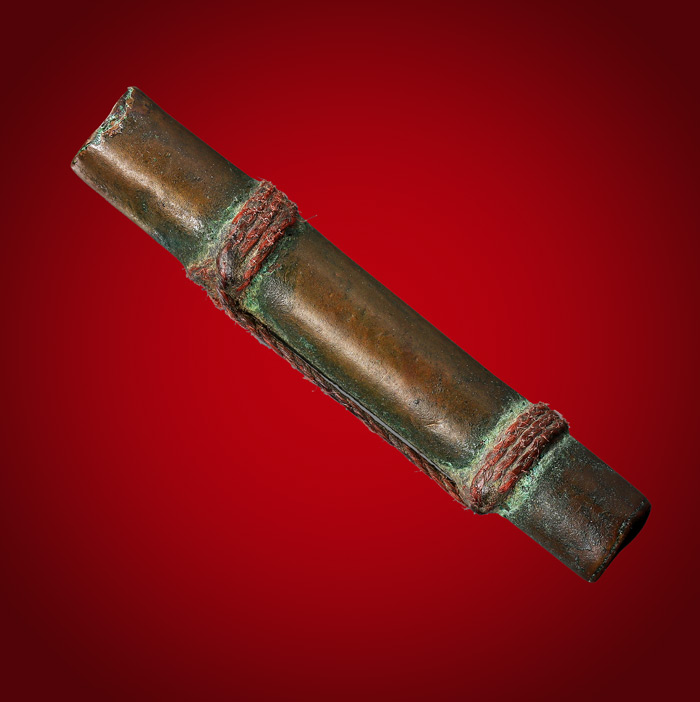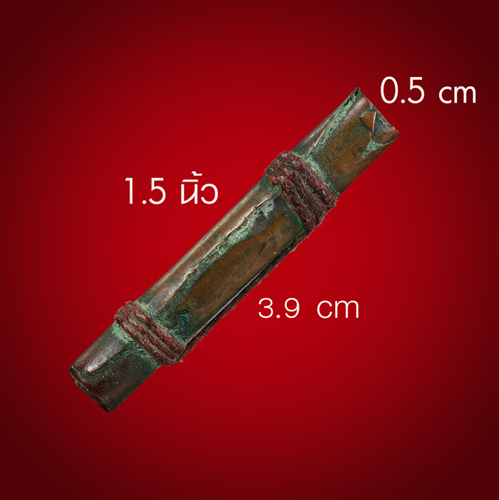 ตะกรุดเก่า เนื้อทองแดง พันเชือก (ไม่ทราบที่สร้าง) ขนาดยาว 1.5 นิ้ว อ้วน 0.5 cm |