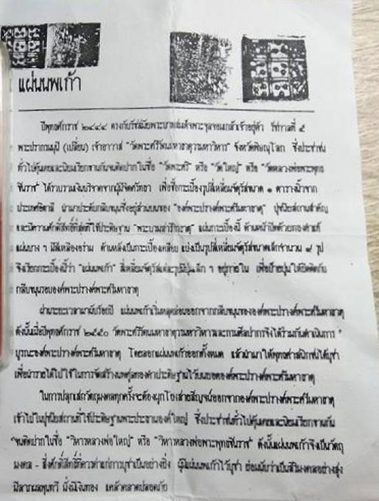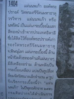 แผ่นนพศูล , นพเก้า หรือ นพรั ต น์ ( แผ่นกระเบื้องโมเสกสีทองนำเข้าจากประเทศอิตาลี ) จากองค์ พระปรางค์เก่า วัดพระศรีรัตนมหาธาตุ " ( วัดใหญ่ , วัดหลวงพ่อพระพุทธชินราช ) อีกทั้งอาบแสงตะวัน แสงจันทรา และผ่านพิธีพุทธาภิเษก .. มามากกว่า 106 ปี ปีพุทธศักราช ๒๔๔๔ ตรงกับรัชสมัยพระบาทสมเด็จพระจุลจอมเกล้าเจ้าอยู่หัว รัชกาลที่ ๕ พระปรากรมมุนี (เปลี่ยน) เจ้าอาวาส "วัดพระศรีรัตนมหาธาตุวรมหาวิหาร"จังหวัดพิษณุโลก ซึ่งประชาชนทั่วไปคุ้นเคยและนิยมเรียกขานกันจนติดปาก ในชื่อ "วัดพระศรี" หรือ "วัดใหญ่" หรือ "วัดหลวงพ่อพระพุทธชินราช" ได้รวบรวมเงินบริจาคผู้มีจิตศรัทธา เพื่อซื้อกระเบื้องรูปสี่เหลี่ยมจัตรัสขนาด ๑ ตารางนิ้วจากประเทศอิตาลิ นำมาประดับกลีบขนุนซึ่งอยู่ส่วนบนของ "องค์พระปรางค์พระศรีมหาธาตุ" ปูชนียสถานสำคัญและมีความศักดิ์สิทธิ์ที่สุดที่ใช้ประดิษฐาน "พระบรมสารีริกธาตุ" แผ่นกระเบื้องนี้ ด้านหน้าปิดด้วยทองคำแท้แผ่นบางๆมีสีเหลืองอร่าม ด้านหลังเป็นกระเบื้องเคลือบ แบ่งเป็นรูปสี่เหลี่ยมจัตรัสขนาดเล็กจำนวน ๙ รูป จึงเรียกกระเบื้องนี้ว่า "แผ่นนพเก้า" แต่ละช่องมีจุด ๓ จุด ๓x๙ = ๒๗ และ ๒ ๗ =๙ บางแผ่นแต่ละช่องมี ๔ จุด ๔x๙ = ๓๖ และ ๓๖ = ๙ และ พระบาทสมเด็จพระจุลจอมเกล้าเจ้าอยู่หัว รัชกาลที่ ๕ ได้ถวายกระเบื้องประดับยอดองค์พระปรางค์หรือ "นพศูล" มีลักษณะแตกต่างจากแผ่นนพเก้า คือ ในช่องตรงกลางมีเพียง 1 จุด.... ในปีพุทธศักราช ๒๕๕๐ กรมศิลปากรได้ดำเนินการบูรณะองค์พระปรางค์พระศรีมหาธาตุ โดยลอกแผ่นนพเก้าออกทั้งหมดแล้วนำออกให้พุทธสนิกชนได้บูชา ซึ่งแผ่นนพเก้านี้มีอายุกว่า 106 ปี และ ในการปลุกเสกวัตถุมงคลของทางวัดทุกครั้งจะต้องผูกโยงสายสิญจน์ออกจากองค์ พระปรางเข้าไปในปูชนียสถานที่ใช้ประดิษฐานพระประธานองค์ใหญ่ หรือ "วิหารหลวงพ่อ" หรือ "วิหารหลวงพ่อพระพุทธชินราช" ดังนั้น แผ่นนพเก้าจึงเป็นวัตถุมงคล-สิ่งศักดิ์ที่ควรค่าแก่การบูชาเป็นอย่างยิ่ง เป็นสิริมงคลอย่างสูง .... นายวินัย ชาญวิชัย ไวยาวัจกรฝ่ายประชาสัมพันธ์ วัดพระศรีรัตนมหาธาตุวรมหาวิหาร ( วัดใหญ่ ) อ.เมือง จ.พิษณุโลก เปิดเผยว่า ขณะนี้วัดพระศรีรัตนมหาธาตุวรมหาวิหาร สถานที่ประดิษฐานพระพุทธชินราช กำลังมีการบูรณะพระปรางค์ประจำวัด ศิลปะสมัยอยุธยา ที่ตั้งอยู่ด้านหลังวิหารพระพุทธชินราช ซึ่งนักวิชาการคาดว่าจะสร้างคร่อมเจดีย์ทรงพุ่มข้าวบิณฑ์ ศิลปะสมัยสุโขทัย และภายในเป็นที่ประดิษฐานองค์พระสารีริกธาตุ เนื่องจากมีสภาพทรุดโทรมลงไปมาก เกรงว่าจะเป็นอันตรายต่อประชาชนที่มาเคารพสักการะสิ่งศักดิ์