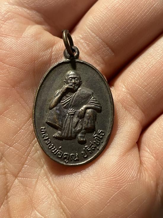 เหรียญหลวงพ่อคูณนั่งยองสูบบุหรี่ รุ่น เทพประธาน ปี2535 ที่ระลึกงานเททองหล่อพระประธาน ณ วัดบ้านไร่ เนื้อทองแดงรมดำ |