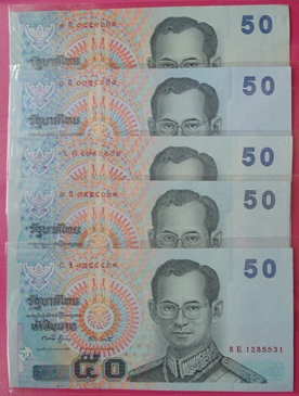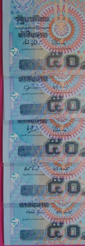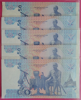 ธนบัตรหมุนเวียน แบบที่ 15 รุ่นที่ 2 ฉบับราคา 50 บาท.พิมพ์ด้วยกระดาษ จำนวน 5 ฉบับ 5 ลายเซ็น สภาพไม่ได้ใช้ ไม่มีรอยพับ มีอมเหลือง 1 ฉบับไม่ทราบว่าเหลืองเองแต่เดิม หรือเก็บแล้วเหลือง ตามรูป