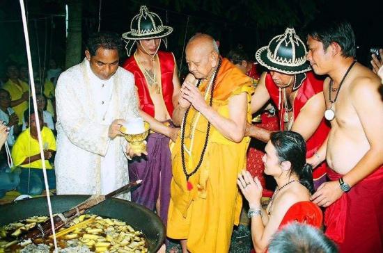 จากนั้นเอากะทะไปตั้งที่เตาที่ก่อไว้สุมด้วยไม้มงคล โดยมีก้านธูปบูชาครูของหลวงปู่มาเป็นเชื้อ