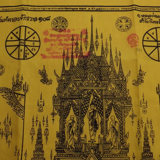 ผืนใหญ่..ขนาด19 X 29 นิ้ว... ผ้ายันต์ครอบจักรวาล 108 หลวงพ่อเกษม รุ่นพุทธคุณ ปี2538 เลข 511 ... (68.7.19 |