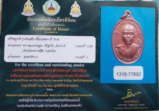 เหรียญหลวงพ่อคูณ วัดบ้านไร่ รุ่นรับเสด็จ บล็อก อ.แตก เนื้อทองแดงผิวไฟ ปี 2536 พร้อมใบประกาศ ติดรางวัลที่ 2 งานจังหวัดจังหวัดกำแพงเพชร (งานสมาคมฯ)