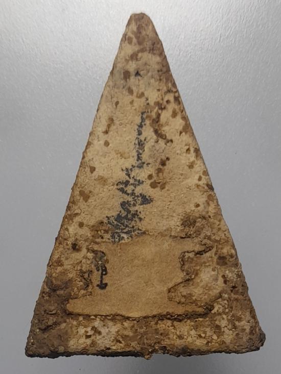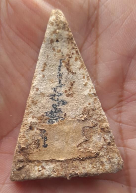 พระเนื้อผงพิมพ์สามเหลี่ยมหลังจารไม่ทราบวัด |