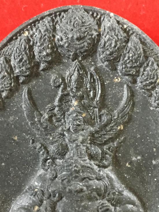 พระนารายณ์ทรงครุฑ ประทับยืนบนพระราหู ล้อมด้วยพระนวนาค 9 เศียร เนื้อใบลาน หลังฝังแผ่นยันต์หนุนดวงทองแดง วัดไตรมิตร ปี 2548 |