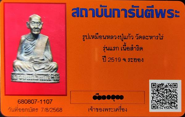 รูปเหมือนหลวงปู่แก้ว วัดละหารไร่ รุ่นแรก เนื้อสำริด ปี 2519 พร้อมบัตร
