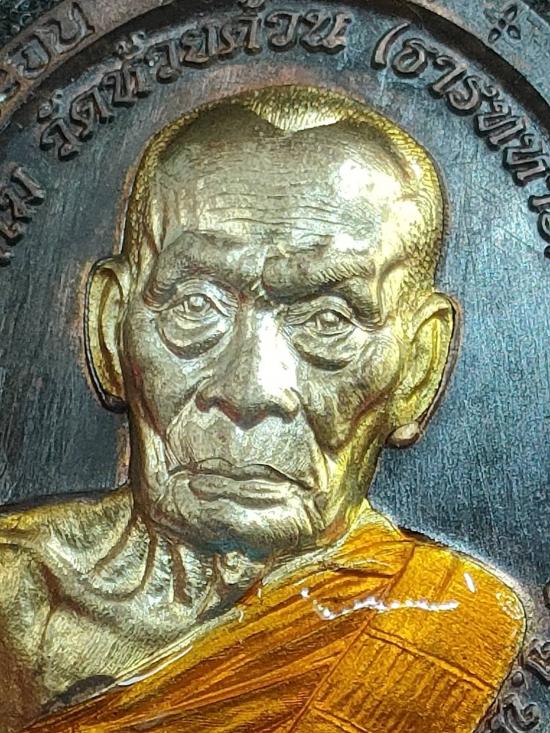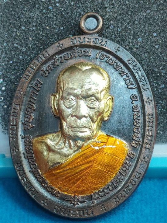 เหรียญชนะจน65 หลวงพ่อพัฒน์ วัดห้วยด้วน ชนวนโบราณสอดไส้เนื้อทองเหลือง ลงยาจีวร เลข224 จมูกร้อย มีกล่อง
