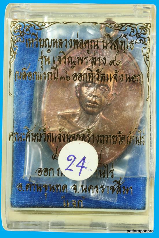 เหรียญหลวงพ่อคูณ รุ่นเจริญพรล่างบล็อกเเรก ปี 2557 เนื้อทองแดงมันปู หมายเลข 24 |