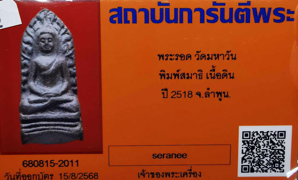 พระรอด วัดมหาวัน พิมพ์สมาธิ(มีหน้าตา) เนื้อดิน ปี2518 จ.ลำพูน + บัตรG-pra สภาพเดิมค่ะ |