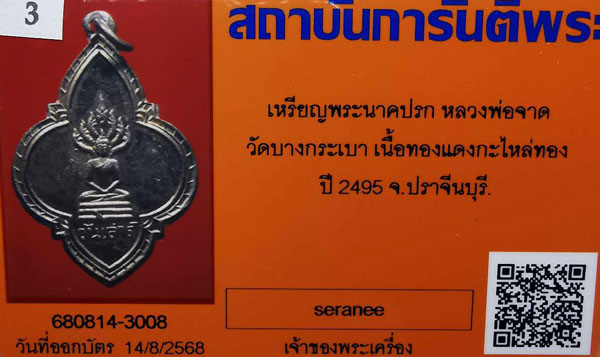 (วันเสาร์)เหรียญพระปางนาคปรก หลวงพ่อจาด วัดบางกระเบา เนื้อทองแดงกะไหล่ทอง ห่วงเดิม ปี2495 จ.ปราจีนบุรี + บัตรG-pra สภาพสวยเดิมค่ะ |