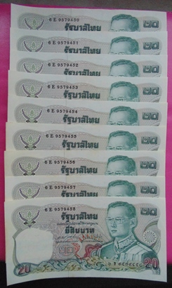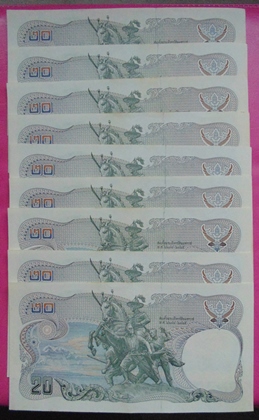 ธนบัตรหมุนเวียน แบบที่ 12 รุ่นที่ 2 ฉบับราคา 20 บาท.เลข 7 หลัก หลังพระเจ้าตากสินทรงม้าศึก จำนวน 9 ฉบับเรียง สภาพไม่ได้ใช้ ไม่มีรอยพับ ธนบัตรสภาพอมเหลืองๆ จากเก็บไม่ดีครับ.
