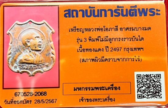 เหรียญหลวงพ่อโอภาสี รุ่น 3 ปี 2497 พร้อมบัตรรับรอง สภาพน่ารัก เน้นพุทธคุณ