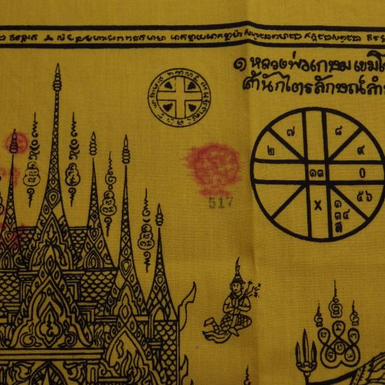 ผืนใหญ่..ขนาด19 X 29 นิ้ว... ผ้ายันต์ครอบจักรวาล 108 หลวงพ่อเกษม รุ่นพุทธคุณ ปี2538 เลข 517 ... (68.7.19 |