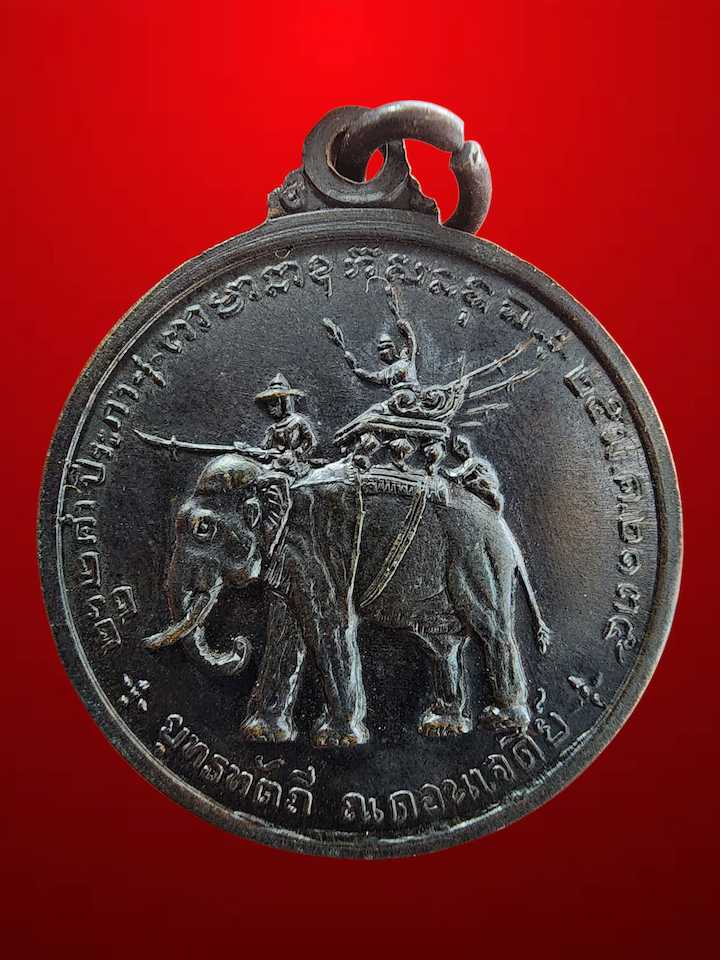 เคาะแรกแดง เหรียญสมเด็จพระนเรศวรมหาราช หลังยุทธหัตถี เนื้อทองแดงรมดำ บล็อก 4 ดาบ ปี 2513 วัดป่าเลไลย์ |
