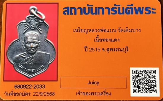 เคาะเดียว**เหรียญหลวงพ่อแบน วัดเดิมบาง จ.สุพรรณบุรี ปี2515 (หลวงพ่อกวยปลุกเสก) พร้อมบัตรรับรอง |