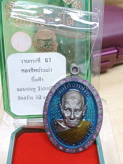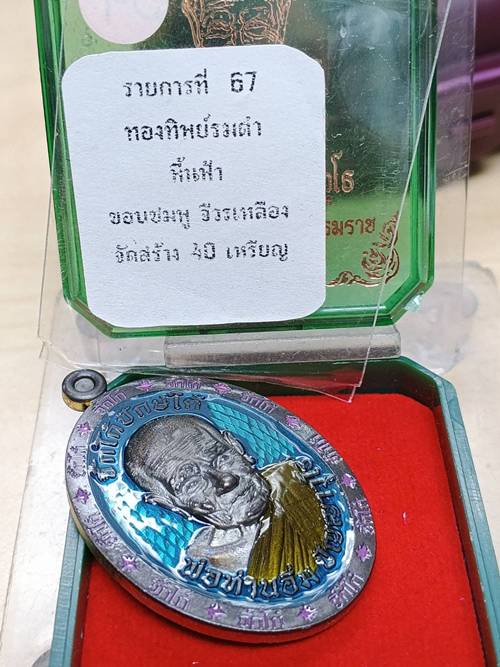 เนื้อทองทิพย์ลงยา พื้นสีฟ้า ขอบชมพู จีวรเหลือง