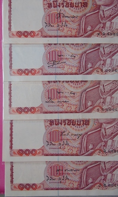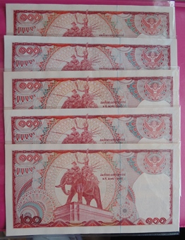 ธนบัตรหมุนเวียน แบบที่ 12 รุ่นที่ 2 ตัวเลข 7 หลัก ฉบับราคา 100 บาท.จำนวน 5 ฉบับ. 5 ลายเซ็น. สภาพใช้น้อยมาก ตามรูป.