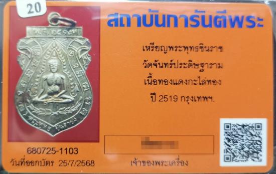 เหรียญพระพุทธชินราช วัดจันทร์ประดิษฐาราม เนื้อทองแดงกะไหล่ทอง ปี2519 จ.กรุงเทพฯ |