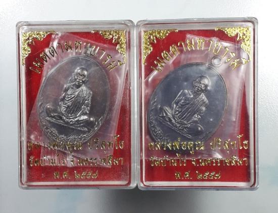 เหรียญเมตตามหาบารมี 2 เหรียญ (พิมพ์เต็มองค์) หลวงพ่อคูณ วัดบ้านไร่ เนื้อทองแดงรมมันปู (โค๊ต"ม") และเนื้อสัตตะโลหะ (โค๊ต"ส") ปี 2557 หมายเลข #๑๖๑๔ และ #๕๒๒ พร้อมกล่องเดิม |
