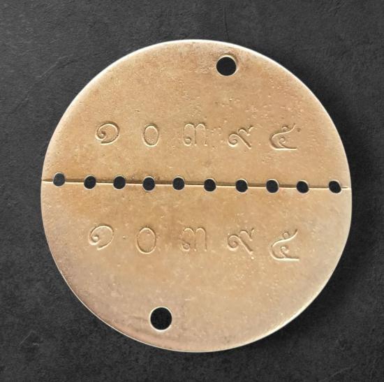 เหรียญประจำตัวออกราชการสงครามทหารไทย มณฑลทหารบกที่ ๑ หมายเลข ๔๑๓๐๙ เหรียญนี้สมบูรณ์ ทหารได้กลับบ้านพบครอบครัวแต่ถ้าเหลือครึ่งเดียวแสดงว่า ทหารท่านนั้นได้พลีชืพครับ |