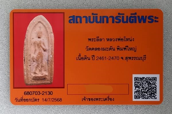 พระลีลากำแพงนิ้ว พิมพ์ใหญ่ เนื้อดิน หลวงพ่อโหน่ง วัดคลองมะดัน ปี 2461-2470 จ.สุพรรณบุรี + บัตร G-Pra