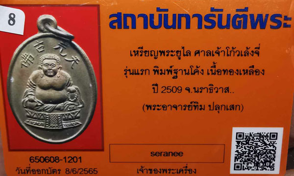 เหรียญพระยูไล ศาลเจ้าโก้วเล้งจี่ พิมพ์ฐานโค้ง เนื้อทองเหลือง ห่วงเดิม ปี2509 จ.นราธิวาส(พระอาจารย์ทิม ปลุกเสก) + บัตรG-pra สภาพเดิมค่ะ |