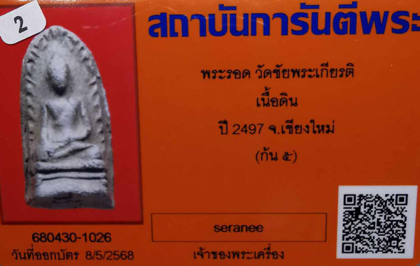 พระรอด วัดชัยพระเกียรติ เนื้อดิน(ก้นเลข๕) ปี2497 จ.เชียงใหม่ + บัตรG-pra สภาพสวยเดิมค่ะ |