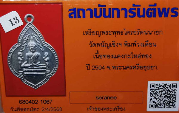 เหรียญพระพุทธไตรยรัตนนายก วัดพนัญเชิงฯ พิมพ์หลังวงเดือน เนื้อทองแดงกะไหล่ทอง ปี2504 จ.พระนครศรีอยุธยา + บัตรG-pra สภาพสวยเดิมค่ะ |