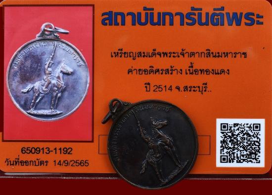 เหรียญสมเด็จพระเจ้าตากสินมหาราช ค่ายอดิศรสร้าง เนื้อทองแดง ปี 2514 จ.สระบุรี พระดี พิธีใหญ่ + บัตรรับรองพระแท้การันตีพระ |