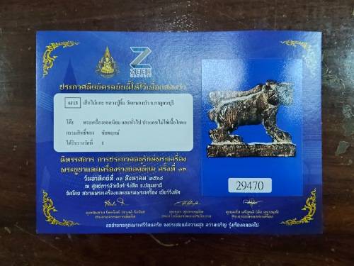 ... หลวงปู่ยิ้มสร้างขึ้นด้วยพิธีการที่เข้มขลัง โดยการนำไม้ในโบสถ์เก่าวัดหนองบัว เป็นไม้ในโบสถ์บางส่วนที่ได้ทำปฏิสังขรณ์ซ่อมแซมในสมัยนั้น (ไม่ใช่ไม้เสาโบสถ์สมัยหลวงปู่เหรียญ) นำมาแกะเป็นเสือ ศิลป์ยุคเก่า ตามคติความเชื่อโบราณ "ไม้โบสถ์นั้นมีความศักดิสิทธิ์มาก เพราะเป็นสถานที่กระทำพิธีกรรมสงฆ์ลงพระอุโบสถ" โดยเฉพาะพระเถราจารย์ต่างๆที่เป็นสหธรรมมิกศิษย์หลวงปู่กลิ่น วัดหนองบัว พระอาจารย์เดียวกัน เช่น หลวงปู่ศุข วัดมะขามเฒ่า หลวงปู่บุญ วัดกลางบางแก้ว ฯลฯ และบรรดาพระเกจิอาจารย์ชื่อเสียงโด่งดังทั่วฟ้าเมืองไทยที่เป็นศิษย์ของท่าน เช่น หลวงพ่อคง วัดบางกะพ้อม หลวงปู่ใจ วัดเสด็จ หลวงปู่เปลี่ยน วัดใต้ หลวงพ่อเหรียญ วัดหนองบัว ฯลฯ เสือตัวนี้มีขนาดใหญ่ ศิลป์ยุคต้น ไม้เก่า แห้ง ดำสนิท ดูง่าย น่าเก็บสะสม |