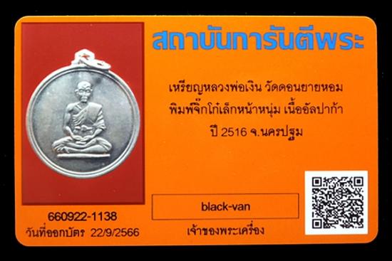 เหรียญจิ๊กโก๋เล็ก หลวงพ่อเงิน วัดดอนยายหอม เนื้ออาปาก้า ปี2516 จ.นครปฐมพร้อม บัตรรับรอง G-pra ครับ |