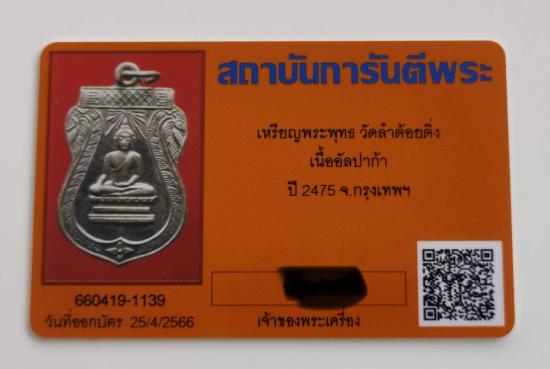 เหรียญพระพุทธ วัดลำต้อยติ่ง เนื้ออัลปาก้า ปี 2475 พร้อมบัตร G-PRA |