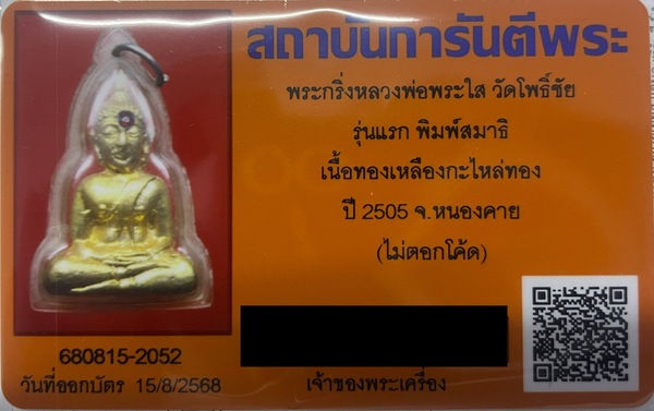 หลวงพ่อพระใส รุ่นแรก ปี2505 วัดโพธิ์ชัย จ.หนองคาย เนื้อทองเหลืองกะไหล่ทอง พิมพ์สมาธิ พลอยแดง นิยม เลี่ยมเดิมๆ! หลวงพ่อพระใส รุ่นแรก ปี2505 ในเวปการันตีพระ น้อยองค์มากๆ ที่จะผ่านได้บัตรรับรองครับ แทบนับองค์ได้ องค์นี้มาพร้อมบัตรรับรอง GPra บูชาสบายใจไม่ต้องลุ้น