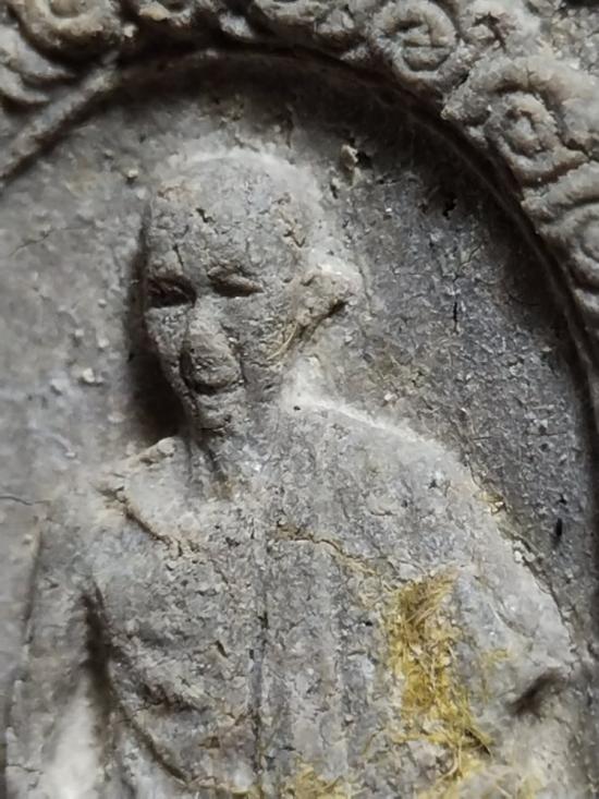 รุ่นนี้ส่วนใหญ่เนื้อผงฟูๆร่วนๆ บางองค์มีเนื้อหลุดร่อนบ้าง แต่องค์นี้จีวรปั๊มในพิมพ์เห็นเกศาที่แก้ม |